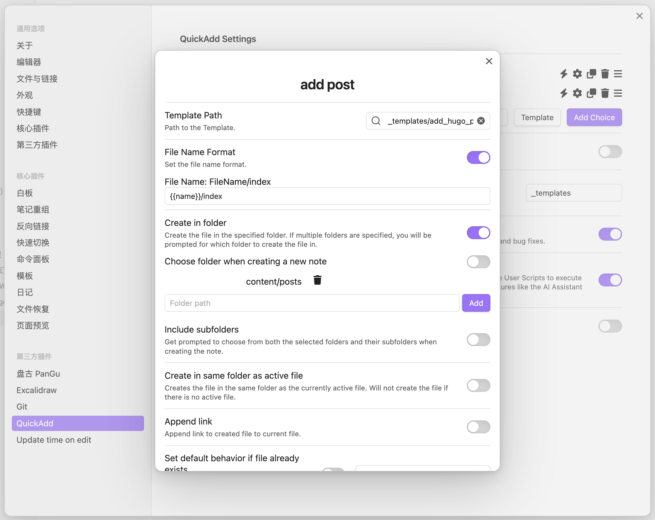 在这样的配置下,使用名为 add post 的 quickadd,将创建一个content/posts/{{name}}/index.md,其中{{name}}为使用 quickadd 时输入的文件名。